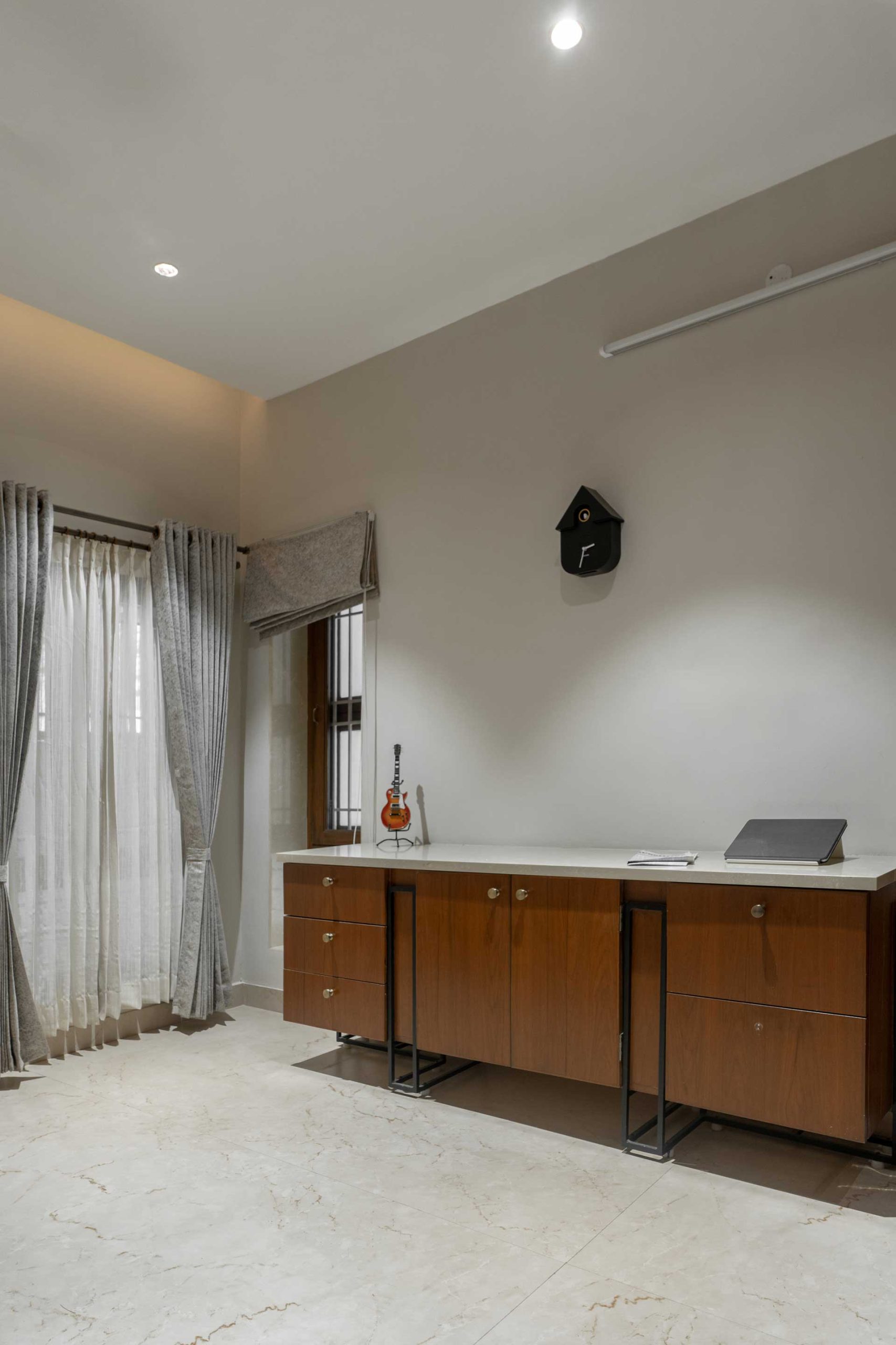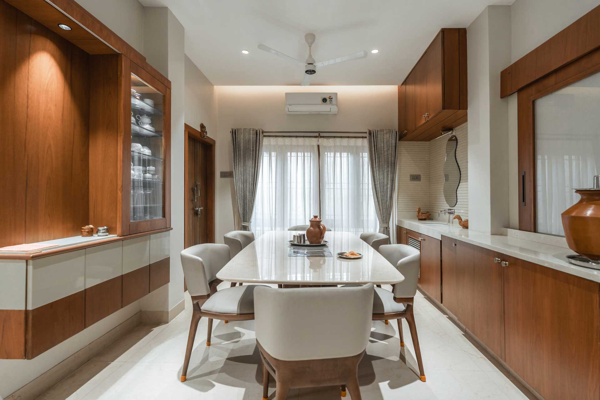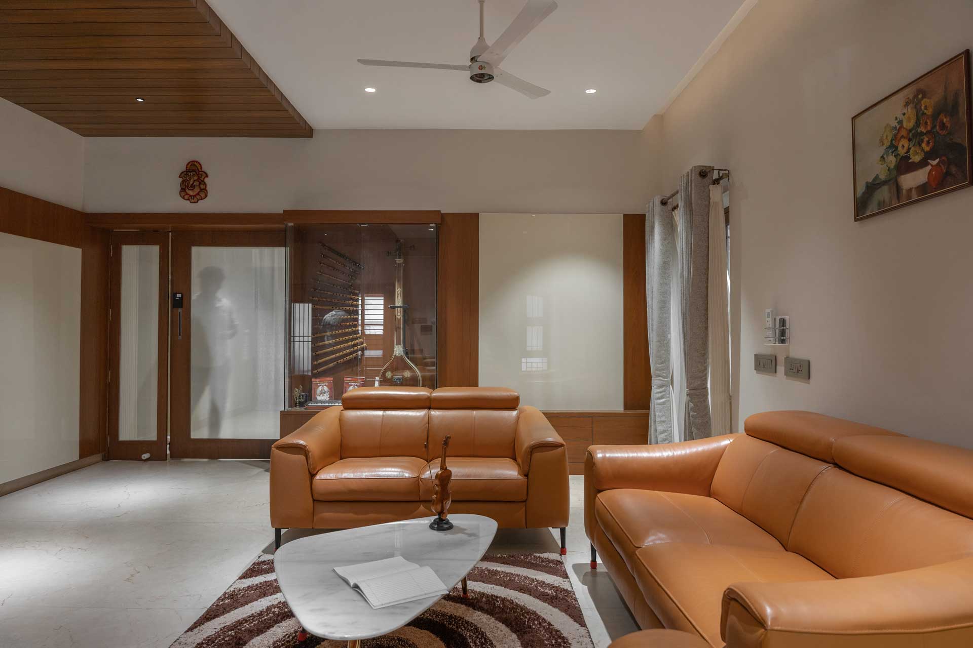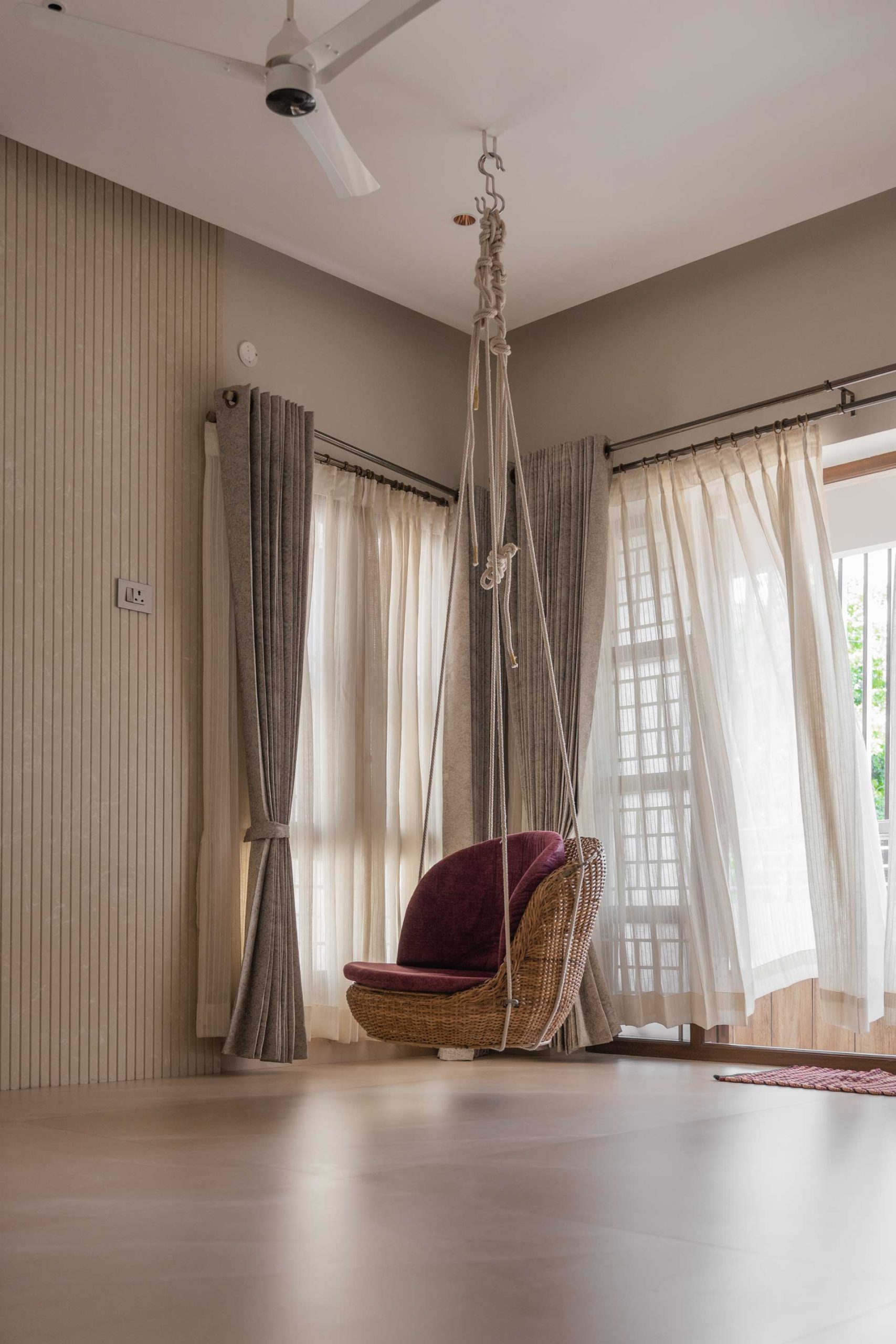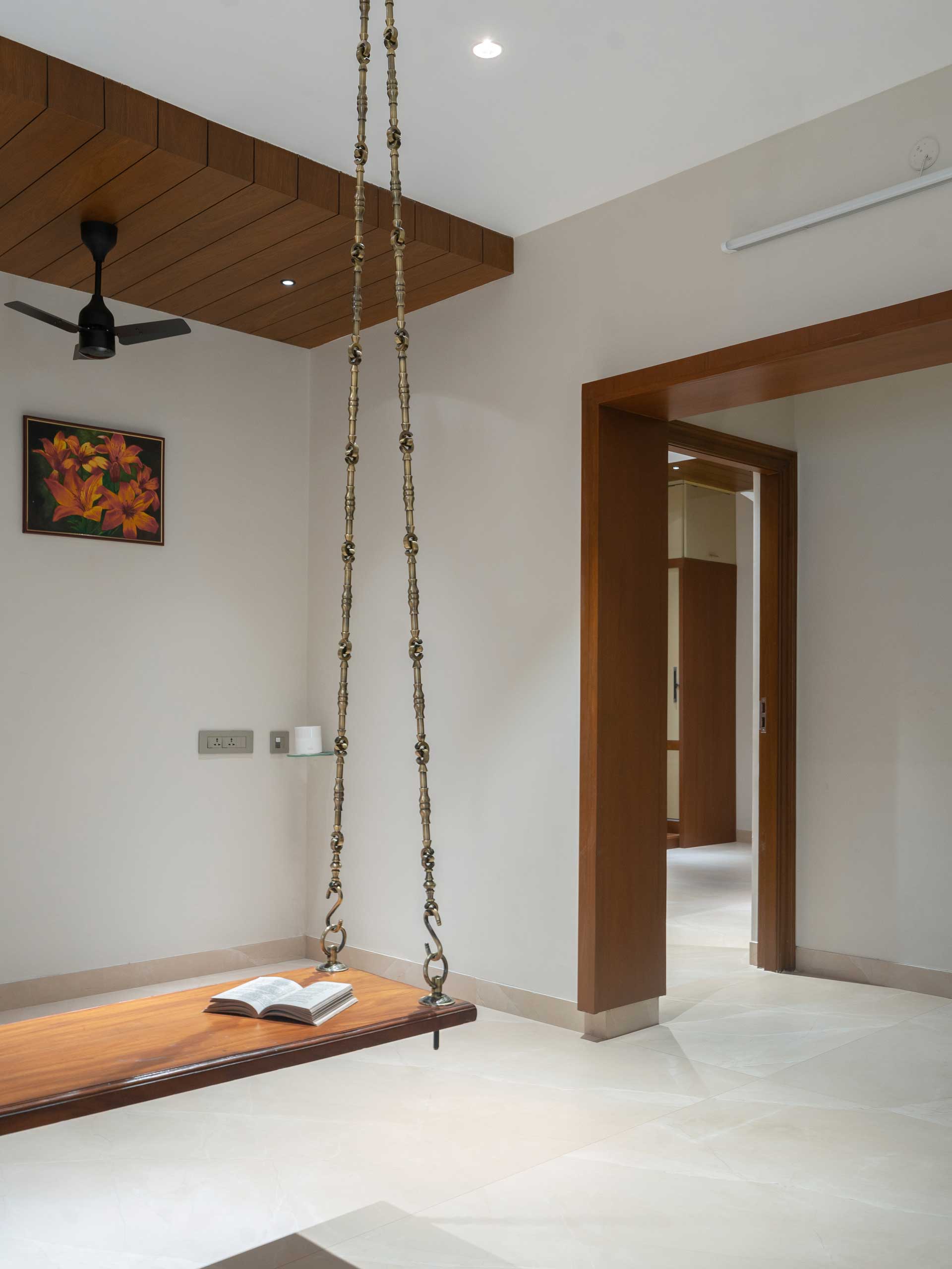 Spaces are designed to feel breathable and unforced, where drapes soften architectural lines and introduce a sense of quiet movement. Throughout the day, the interiors transform subtly, responding to the rhythm of the sun and reinforcing a calm, contemplative way of living. The result is a home that feels luminous, intimate, and timeless—where light is not just welcomed, but curated.